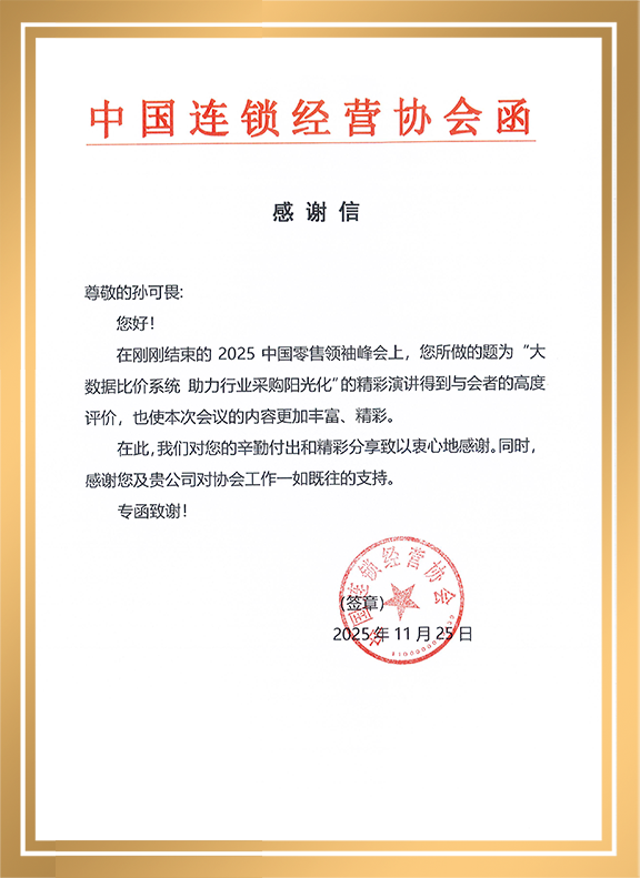 近日,昂捷信息收到一封来自中国连锁经营协会专属感谢信!信中特别致谢昂捷信息董事长孙可畏先生,其在2025中国零售领袖峰会上分享的《大数据比价系统助力行业采购阳光化》主题演讲引发行业强烈反响,该演讲基于昂捷信息在零售数字化领域的创新实践,深度剖析了大数据技术在采购透明化中的应用价值,其前瞻性的行业洞察与众多的实践案例获得与会嘉宾的一致好评,成为峰会最具价值的核心内容之一。此次专函致谢不仅是对昂捷信息技术实力的认可,更是对公司在推动行业数字化转型中所作贡献的高度肯定。