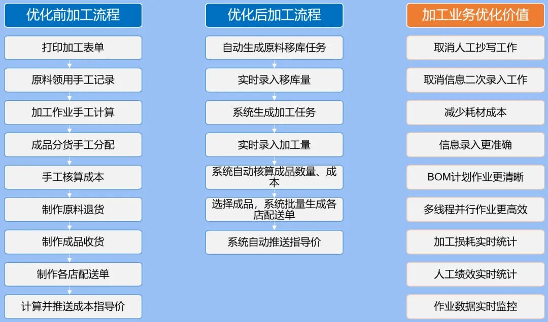 家乐园物流中心在新系统应用前对于生鲜加工管理过程大部分通过纸质单据进行指导作业,流程复杂、工作量大、成本核算困难。通过昂捷WMS加工功能,全部过程通过系统完成,取消人工抄写工作、人工核算工作和信息的二次录入工作,并且对于加工过程的数据通过系统可进行实时查看、实时监控。