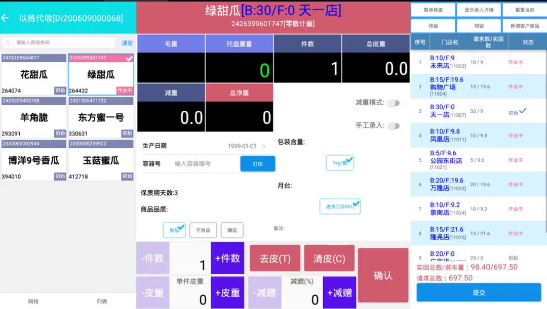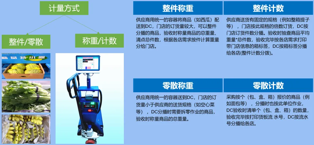 大部分生鲜商品并不仅仅只是按重量进出货和结算,它们一方面按重量流通结算,一方面又要按数量流通来加快作业速度,例如在收货、盘点、分拣、运输、门店交接等环节整箱作业。因此,生鲜称重品既有纯粹称重的商品,也有同时使用了两种计量单位的商品。